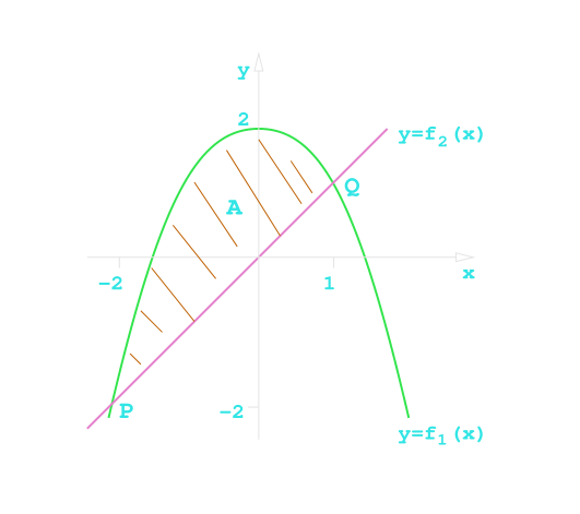 #### Example 1 Calculate the area between these two curves: \begin{align*} y &= f_1(x) = 2 - x^2 \\ y &= f_2(x) = x \end{align*} ![](./images/vimscrot-2021-12-28T15:25:12,556743251+00:00.png) 1. Find the crossing points $P$ and $Q$ \begin{align*} f_1(x) &= f_2(x) \\ x &= 2-x^2 \\ x &= 1 \\ x &= -2 \end{align*} 2. Since $f_1(x) \ge f_2(x)$ between $P$ and $Q$ \begin{align*} A &= \int^1_{-2}\! (f_1(x) - f_2(x)) \mathrm dx \\ &= \int^1_{-2}\! (2 - x^2 - x) \mathrm dx \\ &= \left[ 2x - \frac 13 x^3 - \frac 12 x^2 \right]^1_{-2} \\ &= \left(2 - \frac 13 - \frac 12 \right) - \left( -4 + \frac 83 - \frac 42 \right) \\ &= \frac 92 \end{align*}