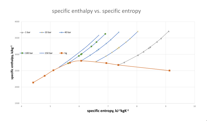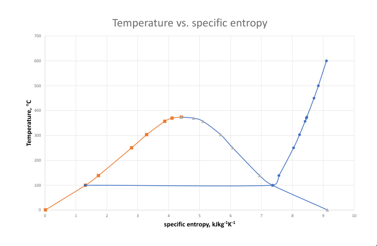 The orange line is liquid, the flat blue bit is wet steam, the steep blue bit is superheated steam.