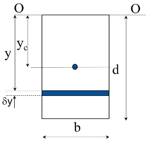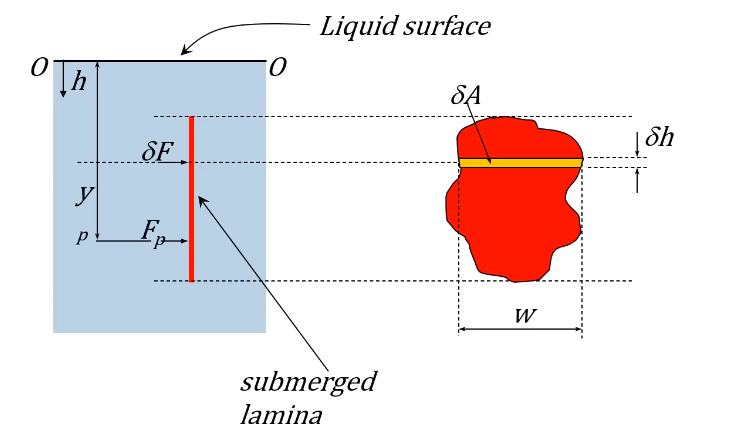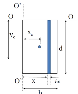 \begin{align*} \delta M_{OO} &= \delta Fh = (\rho gh\delta A)h \ &= \rho gh^2\delta A = \rho gh^2w\delta h \ \ M_{OO} &= F_py_p = \int_{area}! \rho gh^2 ,\mathrm{d}A \ &= \int_{h1}^{h2}! \rho gh^2w ,\mathrm{d}h \ \ y_p = \frac{M_{OO}}{F_p} \end{align*}