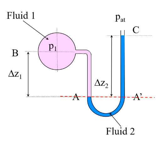\begin{align*} p_{A'} &= p_2 + \rho_mg(z_C - z_B) + \rho_mg(z_B - zA)\ &= p_2 + \rho_mg(z_C - z_B) + \rho_mg\Delta z \ \ p_A &= p_{A'} \ p_1 + \rho_wg(z_C-z_A) &= p_2 + \rho_mg(z_C - z_B) + \rho_mg\Delta z \ p_1 - p_2 &= \rho_wg(z_C-z_B-z_C+z_A) + \rho_mg\Delta z \ &= \rho_wg(z_A-z_B) + \rho_mg\Delta z \ &= -\rho_wg\Delta z + \rho_mg\Delta z \end{align*}
