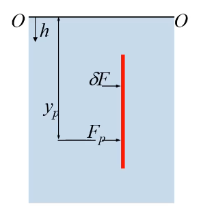 \begin{align*} \delta M_{OO} &= \delta Fh = (\rho gh\delta A)h \ &= \rho gh^2\delta A = \rho gh^2w\delta h \ \ M_{OO} &= F_py_p = \int_{area}! \rho gh^2 ,\mathrm{d}A \ &= \int_{h1}^{h2}! \rho gh^2w ,\mathrm{d}h \ \ y_p = \frac{M_{OO}}{F_p} \end{align*}