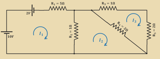 \begin{align*} 0 &= 10 - 2 - V_1 - V_2 \ &= 8 - I_1R_1 - (I_1-I_2)R_2 = 0 \ 8 &= I_1(R_1+R+2) - I_2R_2 \ &= 6I_1 - I_2 \end{align*}
