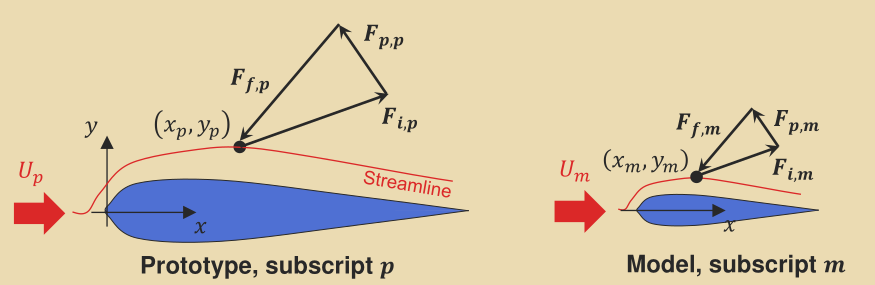 An airfoil model and prototype are geometrically similar, with 1:\alpha length ratio: